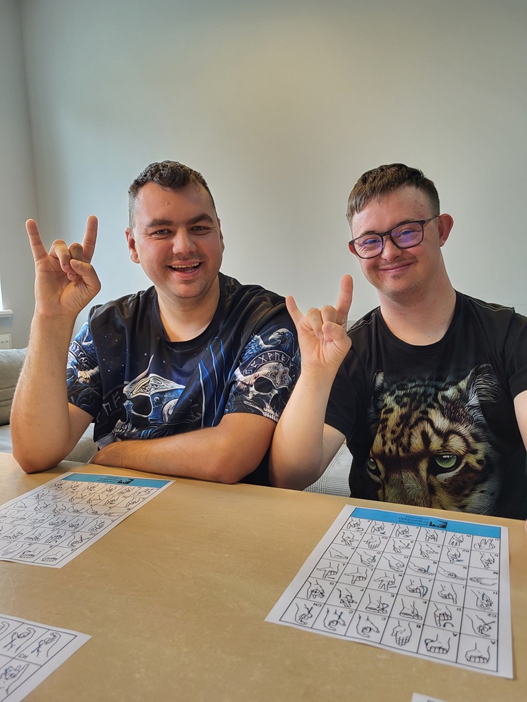 W ramach zajęć usprawniających aparat mowy ćwiczyliśmy alfabet języka migowego palcowego.