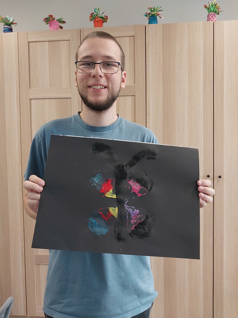 Na zajęciach manualnych uczestnicy odciskali liście pomalowane farbami. Powstały z tego piękne kolorowe motyle. Dzięki zajęciom uczestnicy rozwijali wyobraźnię