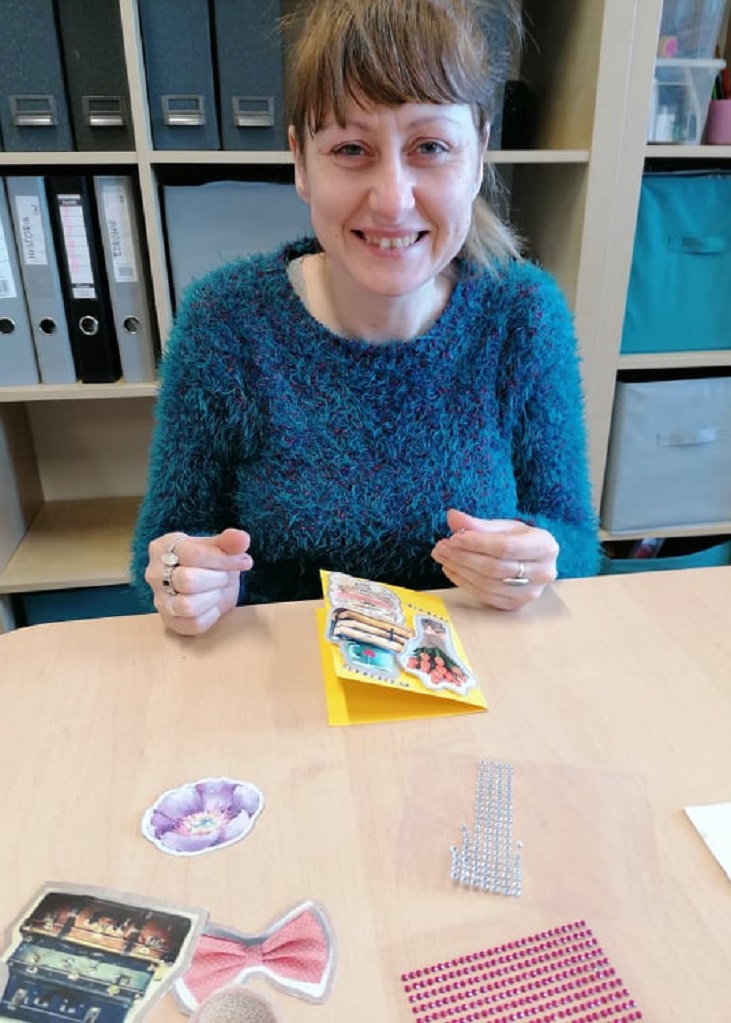Podczas zajęć manualnych Panowie przygotowali kartki z okazji Dnia Kobiet. Wręczyli je wszystkim Paniom z ŚDS i OREW-u.