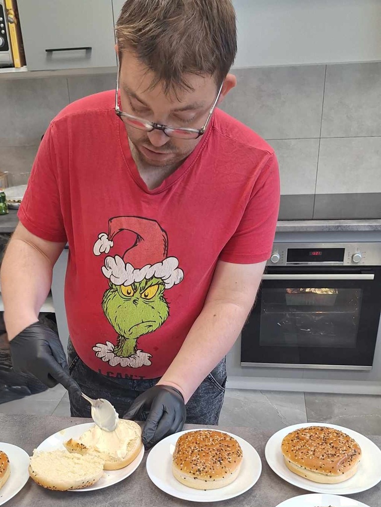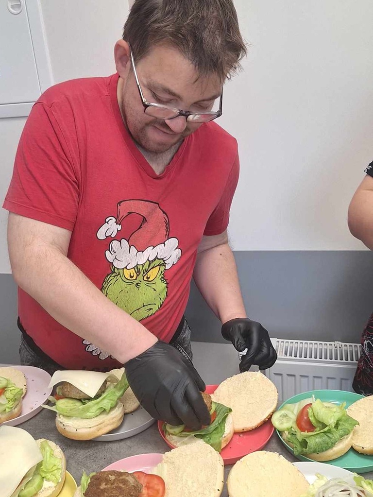 Z okazji Dnia Hamburgera, uczestnicy wzięli udział w wyjątkowych zajęciach kulinarnych, które połączyły naukę, zabawę i integrację. Celem treningu było przygotowanie pysznych hamburgerów, rozwijanie umiejętności kulinarnych promowanie zdrowego stylu życia oraz wspólne spędzanie czasu w miłej atmosferze. Pod okiem terapeutów, uczestnicy zapoznali się z przepisem na klasycznego hamburgera oraz jego wariantami. Samodzielnie przygotowali składniki, oraz smażyli kotlety. Nie zabrakło także nauki o higienie w kuchni oraz zasadach zdrowego odżywiania.