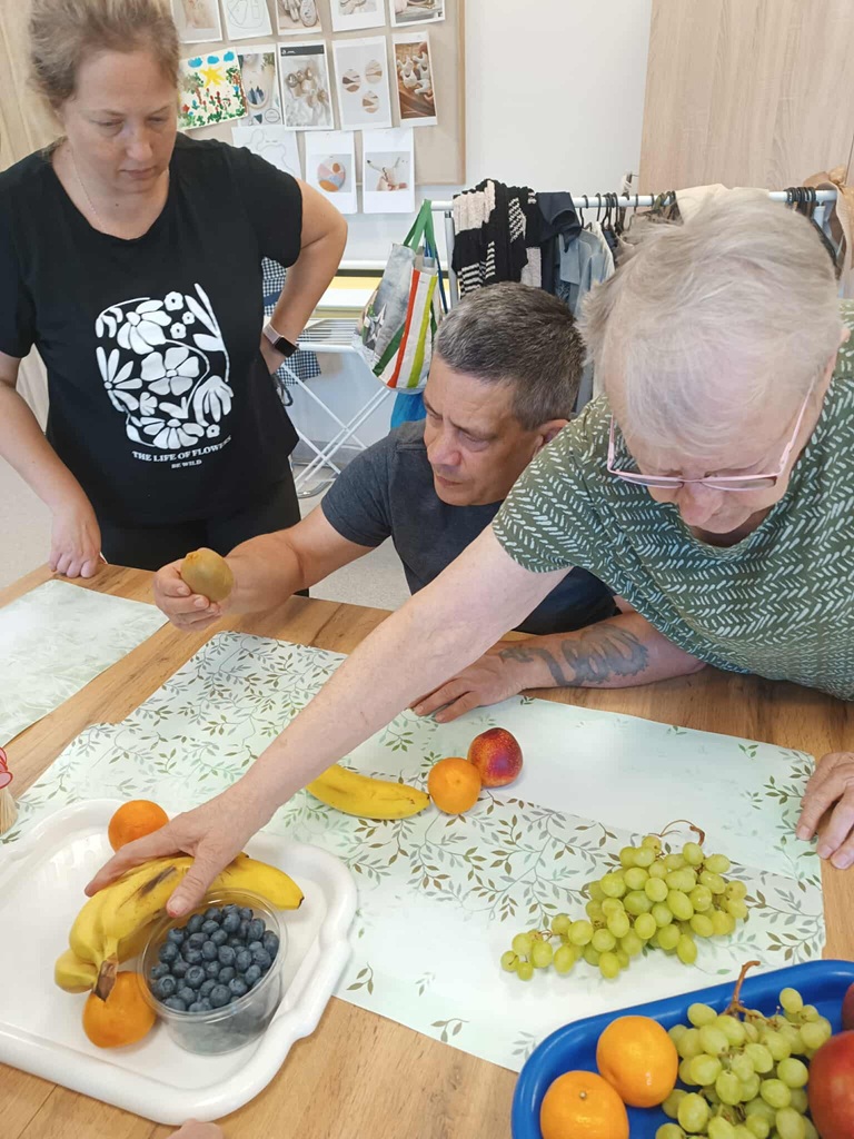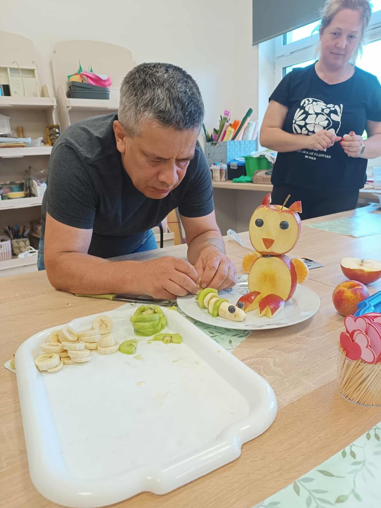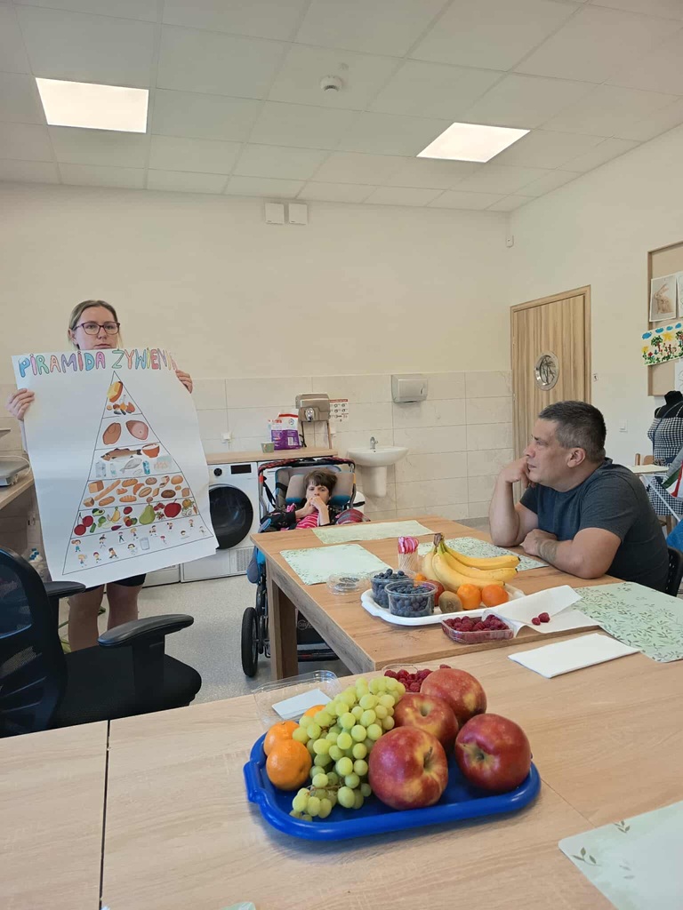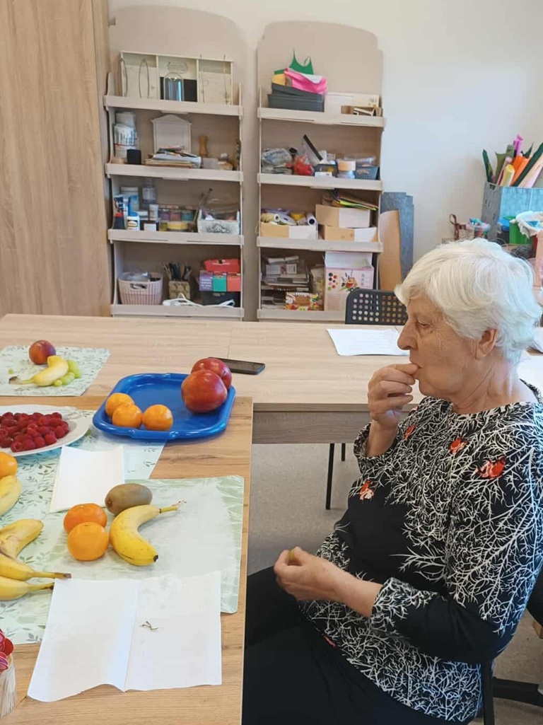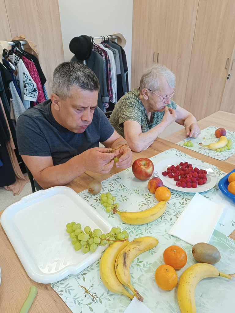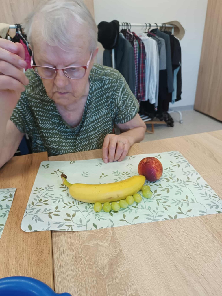 Rozpoznawaliśmy owoce wszystkimi zmysłami, bawiliśmy się w quiz, słuchaliśmy bajki terapeutycznej na świeżym powietrzu, a na koniec stworzyliśmy grupowo owocowe stworki! Do tego wąchaliśmy suszony czarny bez i schowaliśmy go na domową herbatkę. To był pyszny i pachnący dzień!