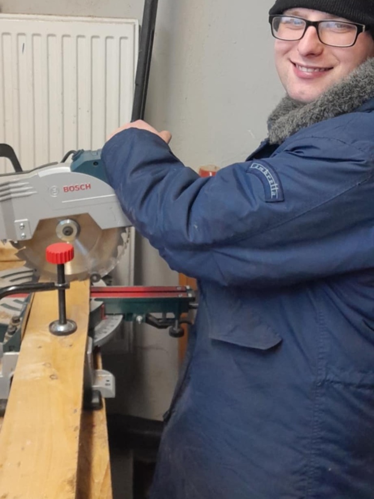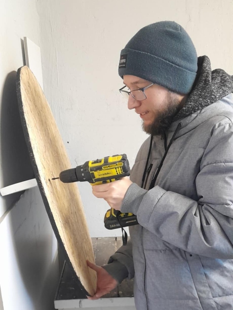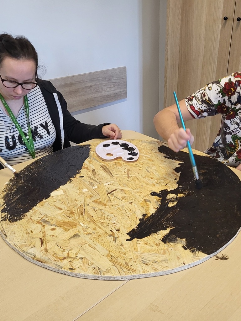 Podczas zajęć stolarskich panowie pod czujnym okiem terapeuty przygotowali z płyty OSB duże koło oraz wykonali półki z desek. Następnie na zajęciach manualnych wszystkie elementy zostały starannie pomalowane i wysuszone.
