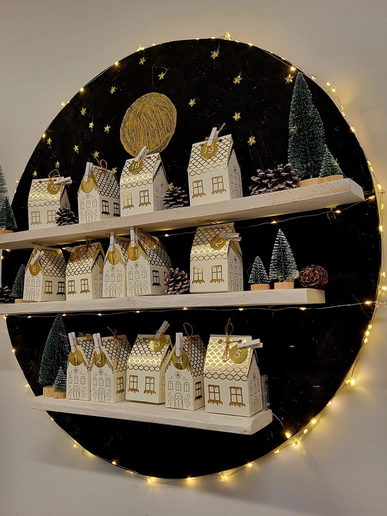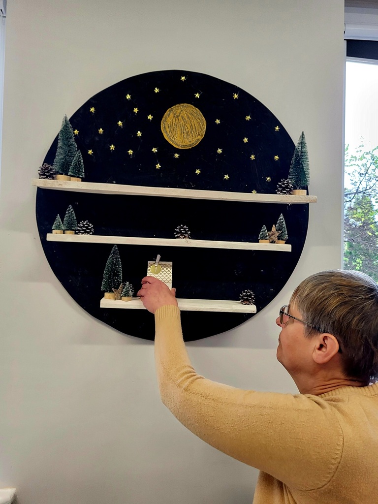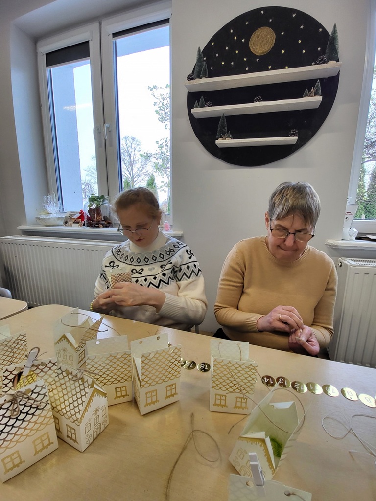 W kolejnym etapie złożyliśmy papierowe domki, do których włożyliśmy karteczki z zadaniami oraz drobne słodkości. Całość dopełniły choinki, szyszki i delikatne światełka, tworząc spójny i nastrojowy kalendarz adwentowy.