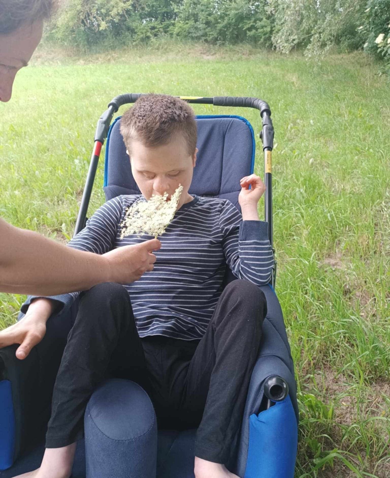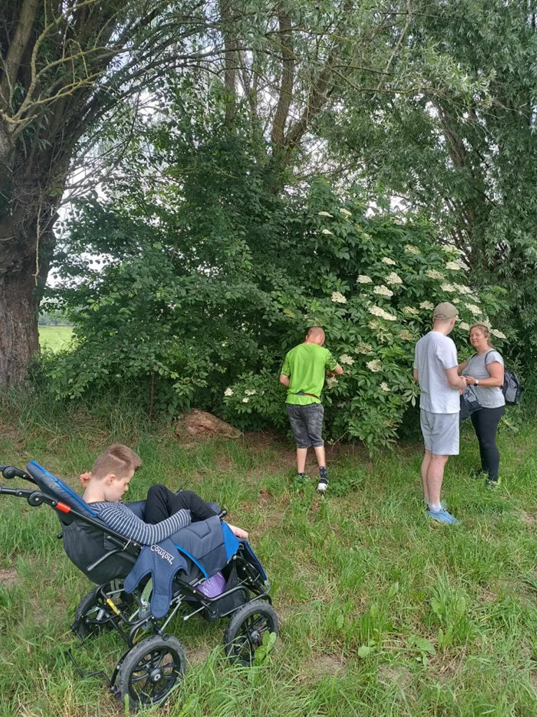 Podczas zajęć z naturoterapii wybraliśmy się w plener, by zbierać kwiaty czarnego bzu. Uczestnicy mieli okazję poznać jego zapach, wygląd oraz właściwości zdrowotne. Wspólne zbieranie było okazją do relaksu, kontaktu z naturą i aktywności na świeżym powietrzu. Po powrocie rozłożyliśmy zebrane kwiaty do suszenia – posłużą do przygotowania syropu lub herbaty. To był piękny, terapeutyczny czas pełen spokoju i uważności.