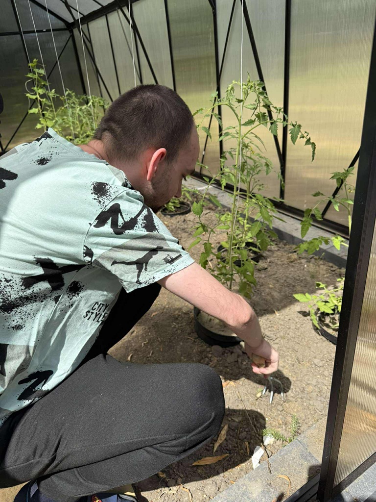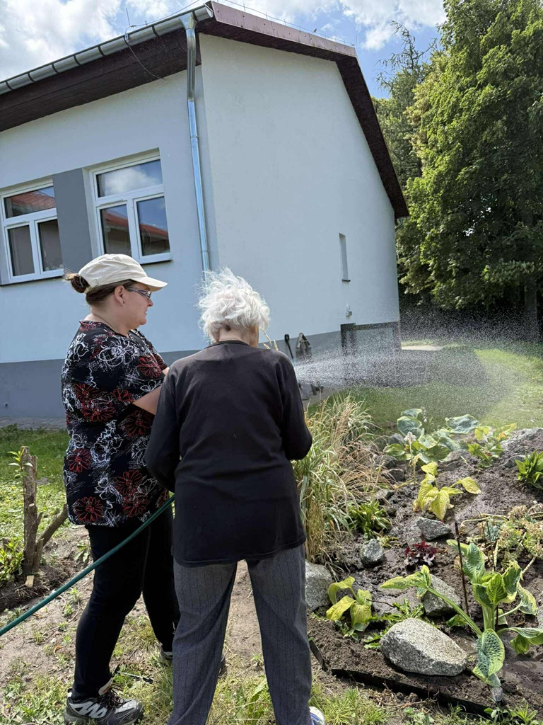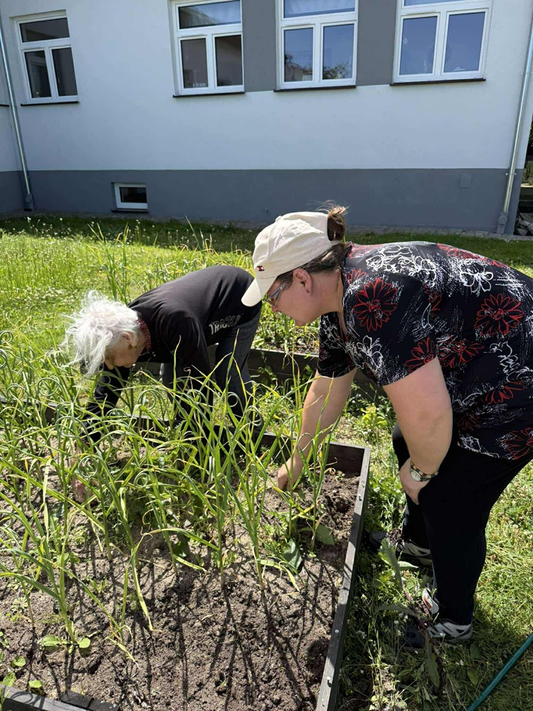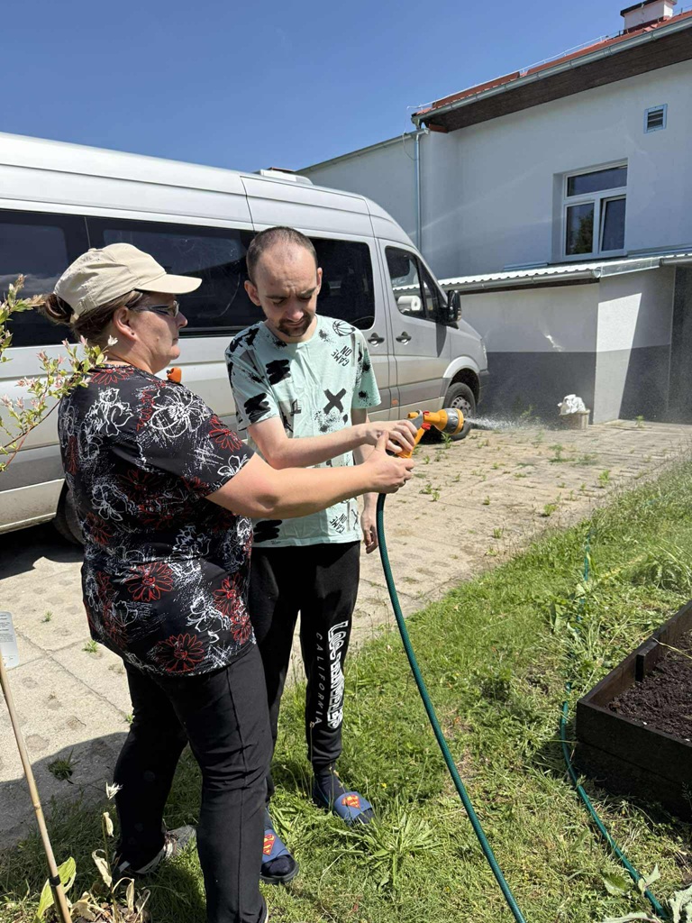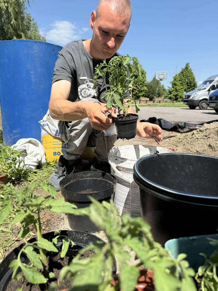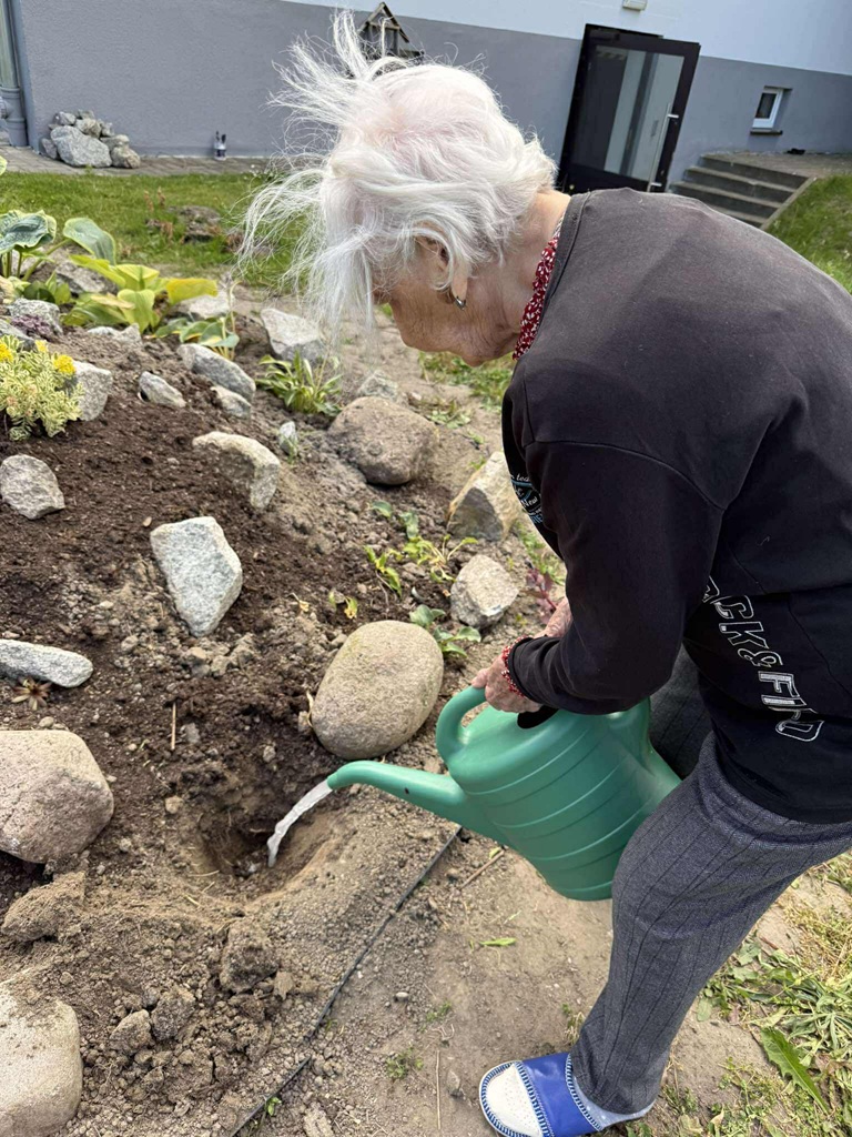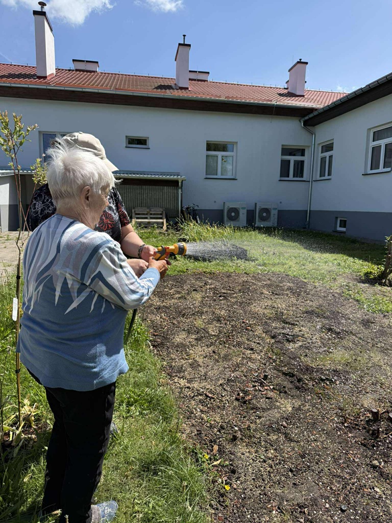 Wraz z uczestnikami na bieżąco pielęgnujemy nasz ogród. W ten słoneczny dzień udało nam się wykonać wiele prac w naszym ogrodzie. Zasadziliśmy nowe kwiaty oraz podlaliśmy warzywa, drzewka i inne rośliny, które zasadziliśmy. Spędziliśmy miło czas oraz skorzystaliśmy z pogody i słoneczka. Wspólnymi siłami działamy, aby nasz zielony kącik wyglądał pięknie i estetycznie.