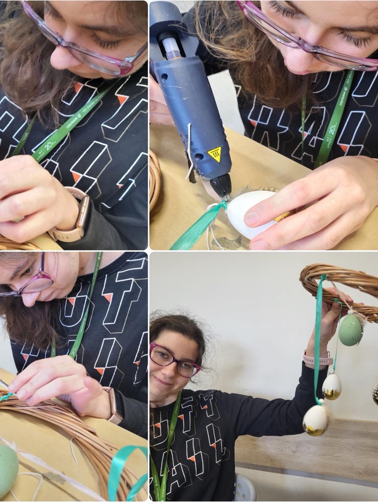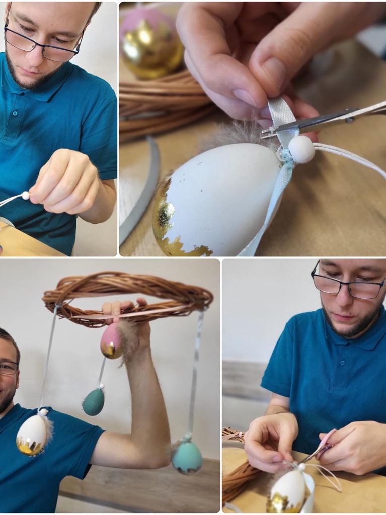W ramach projektu PFRON „Więcej mnie”, forma wsparcia Terapia z kulturą, uczestnicy przygotowali dekoracje sali z wiklinowych wianków, które ozdobili zielenią oraz zawieszanymi jajkami. Praca wymagała precyzji, cierpliwości i współpracy, a efektem są piękne, wiosenne ozdoby, które wprowadzają do naszej przestrzeni świąteczny nastrój.