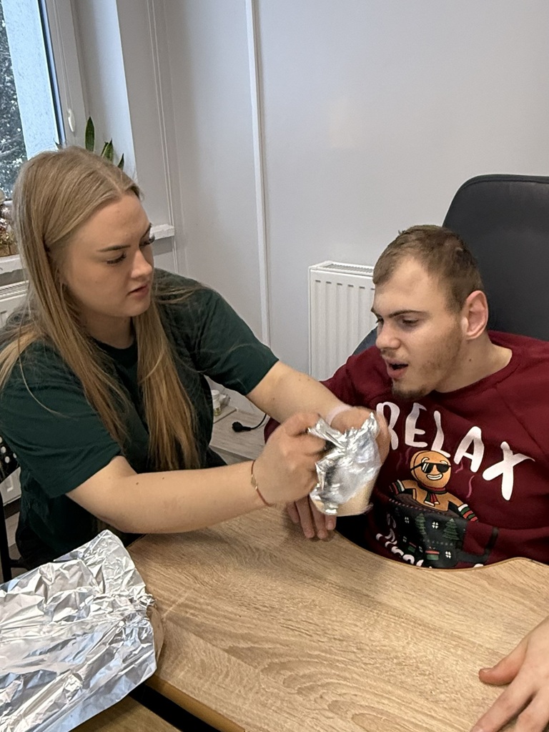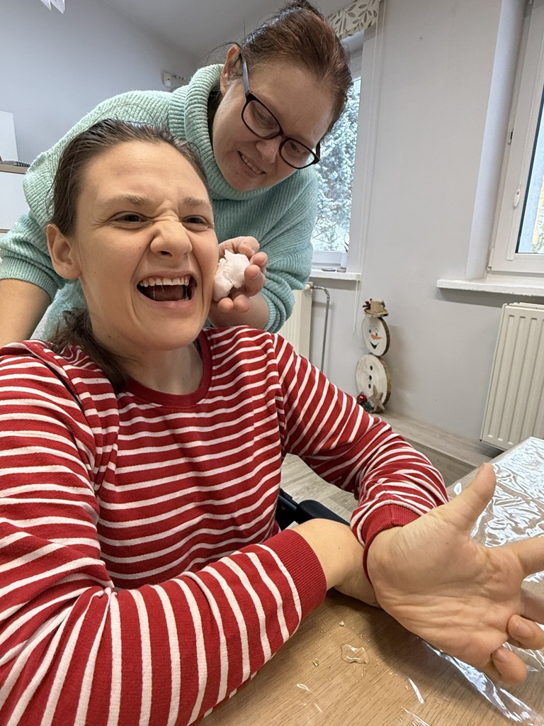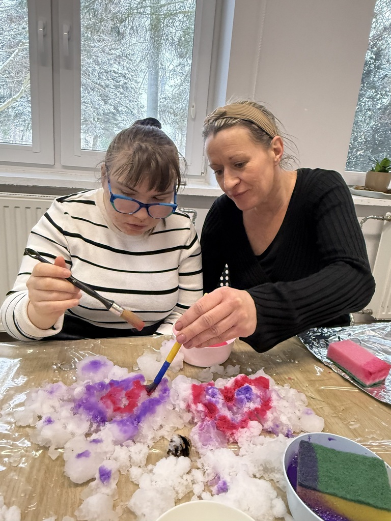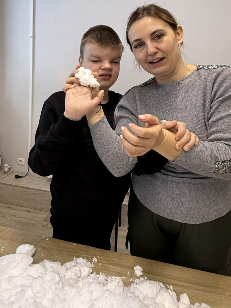Dodatkową formą aktywności były zabawy z aluminiowymi „śnieżkami”, które podawaliśmy i rzucaliśmy do siebie, stymulując koordynację wzrokowo-ruchową oraz percepcję słuchową i wzrokową. Zwieńczeniem zajęć było malowanie śniegu rozwodnionymi farbami, dzięki czemu dzieci tworzyły abstrakcyjne obrazy i zimowe pejzaże, rozwijając ekspresję twórczą i sensoryczną.