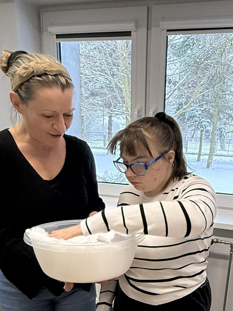 Podczas zajęć uczestnicy mieli okazję bezpośrednio doświadczać zimowej przyrody – poznawali śnieg poprzez dotyk, ugniatanie i obserwację jego właściwości, takich jak niska temperatura i zmiana konsystencji. Wspólnie lepiliśmy bałwany oraz kule śnieżne, a także poszukiwaliśmy w śniegu szyszek, ćwicząc percepcję wzrokową i koncentrację uwagi.