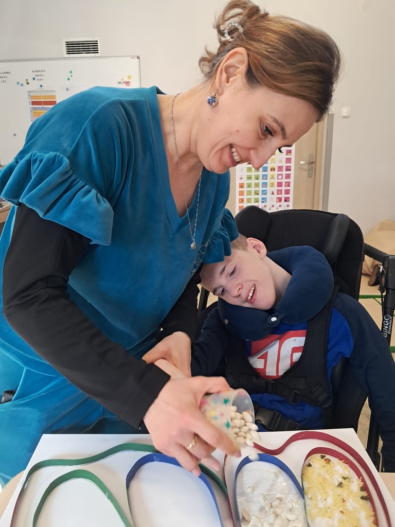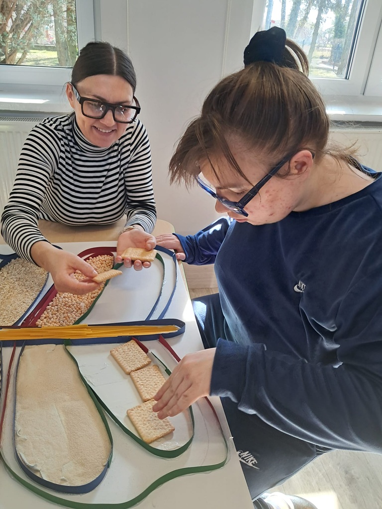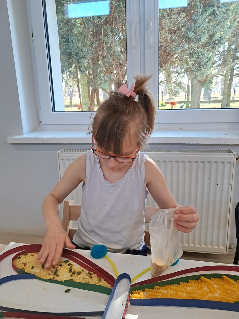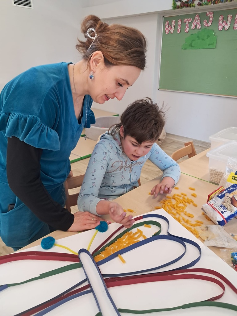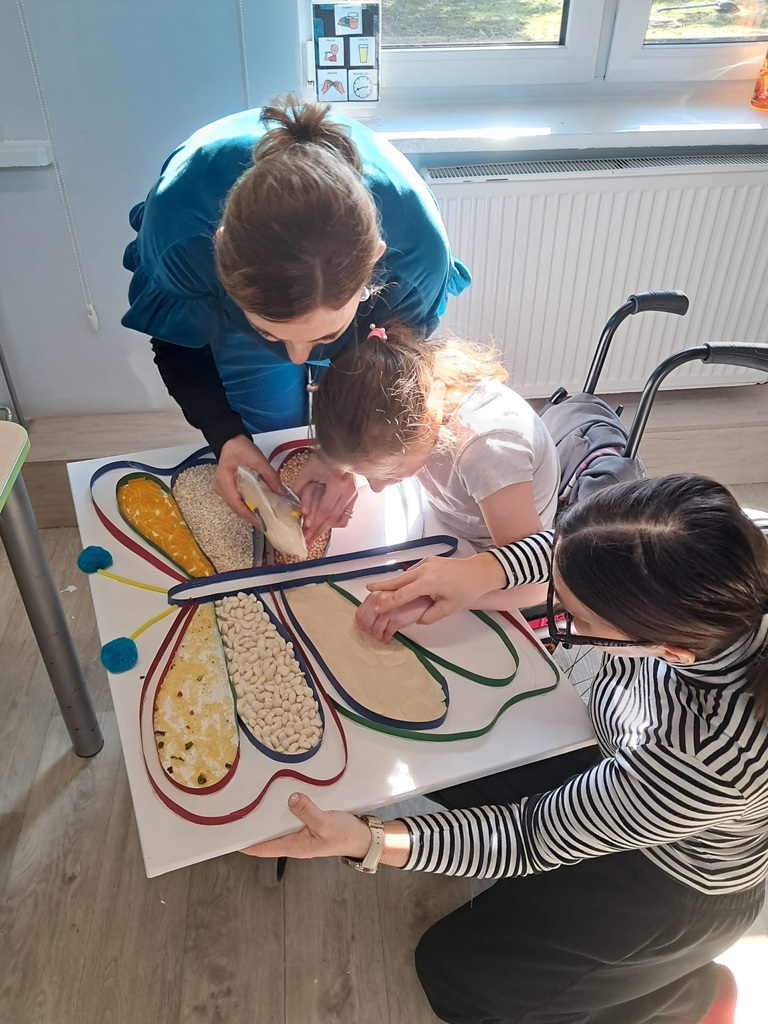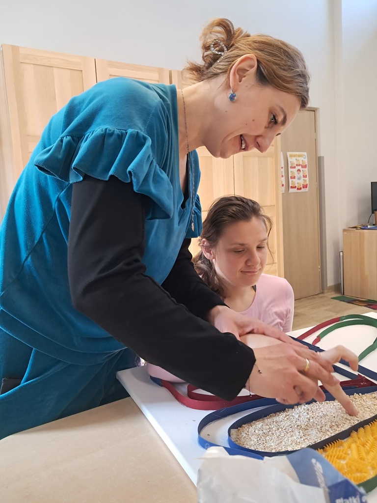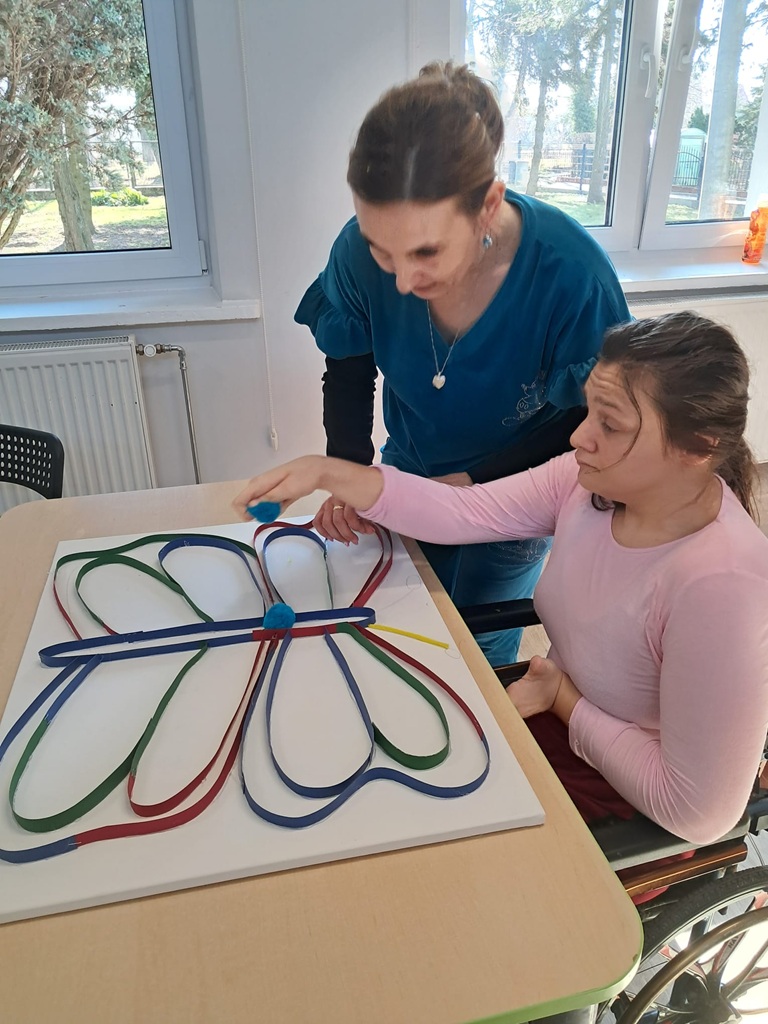Podczas zajęć sensorycznych wychowankowie poznawali różne faktury, pracując z makietą motyla wykonaną z materiałów o zróżnicowanej strukturze. Była to okazja do stymulacji zmysłu dotyku oraz wspólnej aktywności. Zajęcia zrealizowano w ramach projektu finansowanego ze środków PFRON, „Balustrady i poręcze 2”.