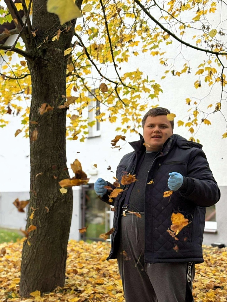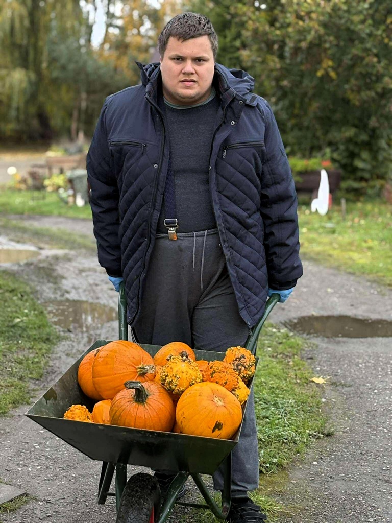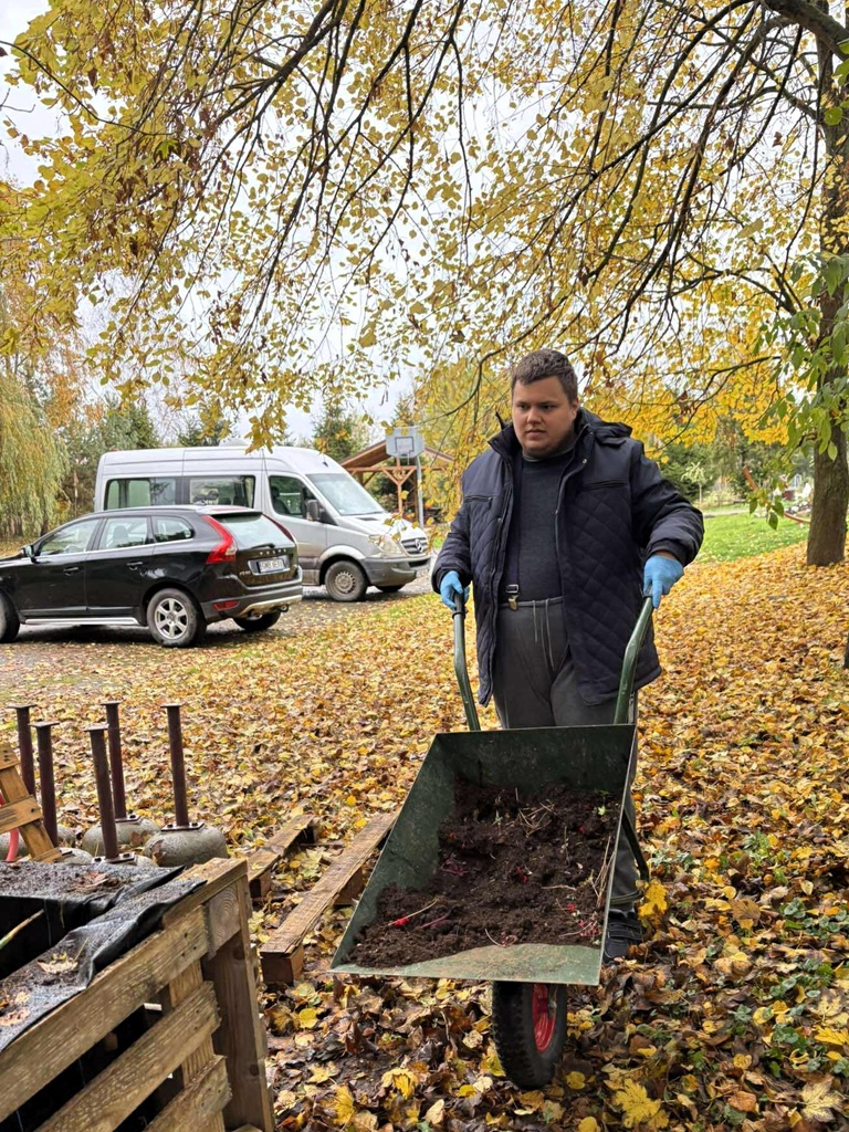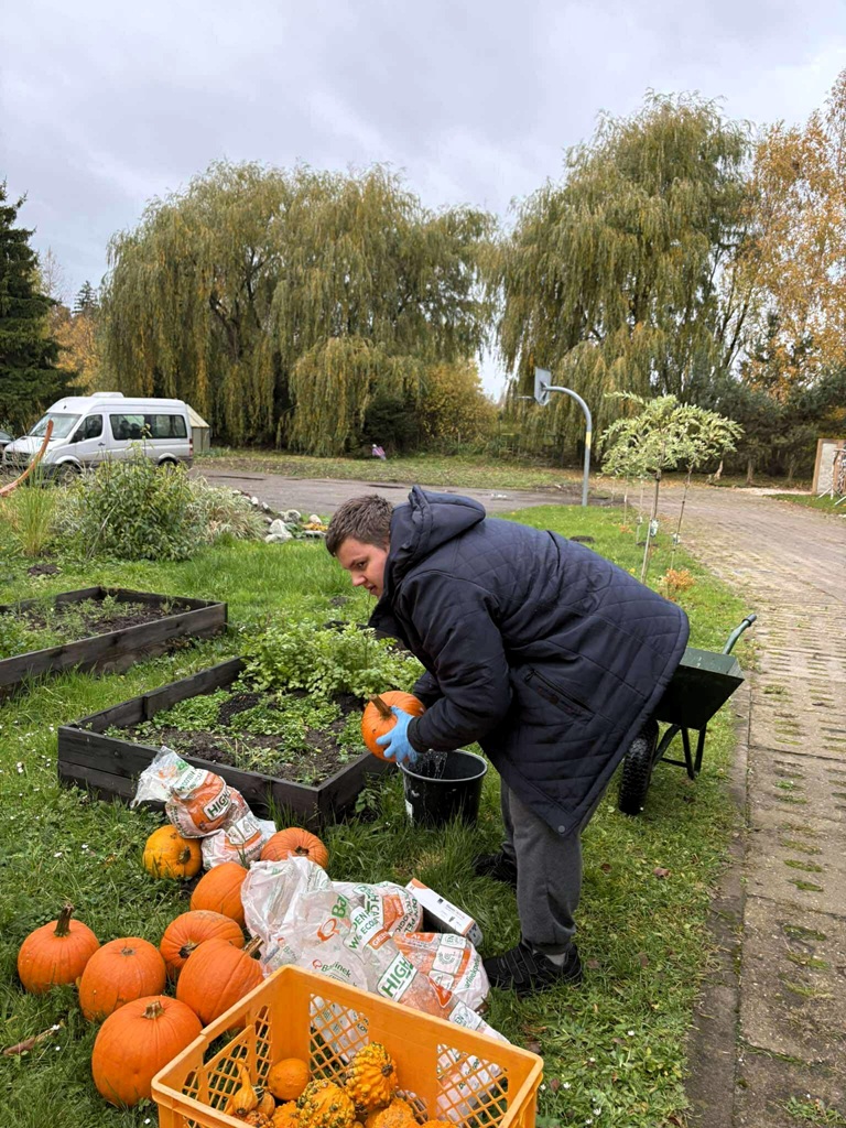 W ramach projektu „RównoWażni” dofinansowanego przez PFRON, podczas indywidualnych zajęć w ramach terapii naturą uczestnik spędził czas na świeżym powietrzu, wykonując jesienne porządki w ogrodzie. Prace obejmowały porządkowanie roślin oraz przygotowanie ogrodu do nadchodzącej zimy. Dodatkowo została udekorowana przestrzeń wokół ośrodka dyniami różnej wielkości.