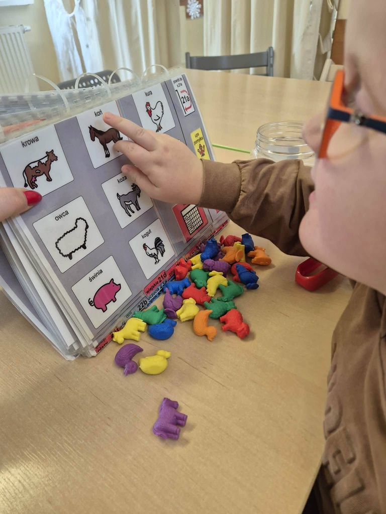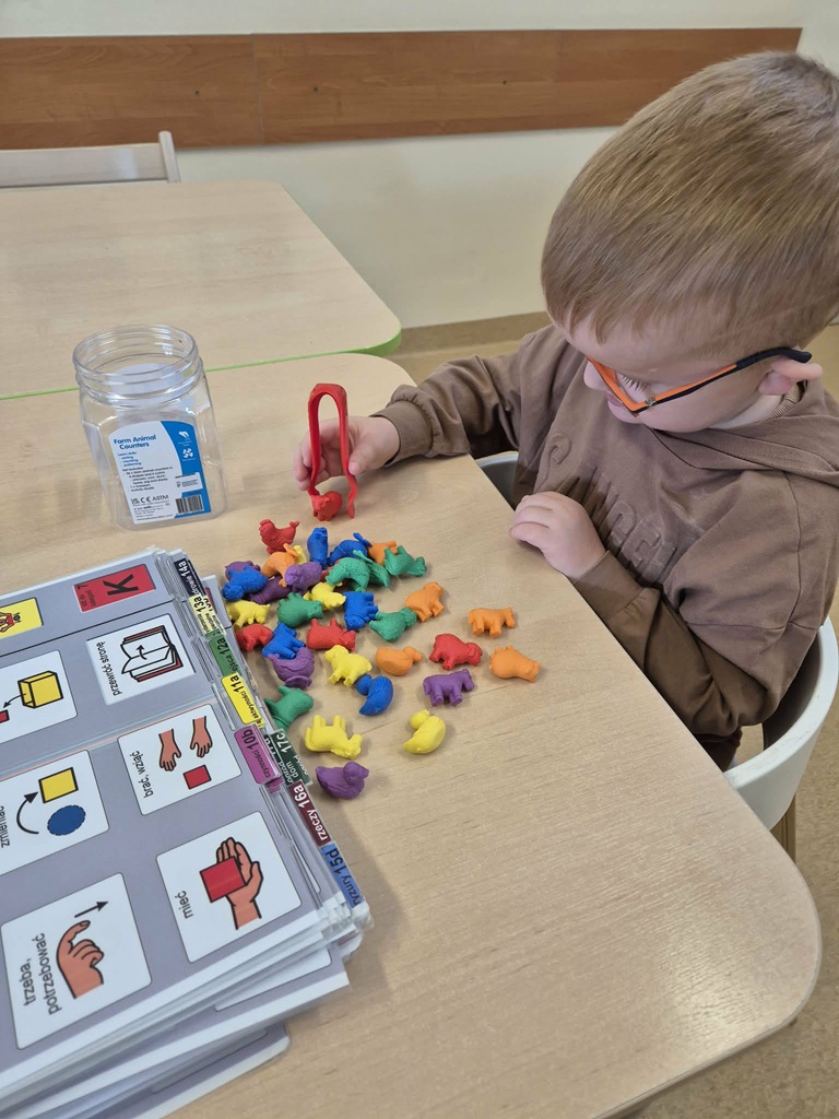 Podczas zajęć rewalidacyjnych wychowanek wykonywał ćwiczenia usprawniające motorykę małą, koordynację wzrokowo-ruchową oraz koncentrację uwagi. Chłopiec wykonywał zadanie polegające na przenoszeniu małych figurek za pomocą szczypców do pojemnika, co sprzyjało wzmacnianiu mięśni dłoni i palców, doskonaleniu chwytu pęsetkowego oraz rozwijaniu precyzji ruchów. Ćwiczenia wymagały planowania ruchu, kontroli wzrokowej oraz skupienia na zadaniu przez określony czas.