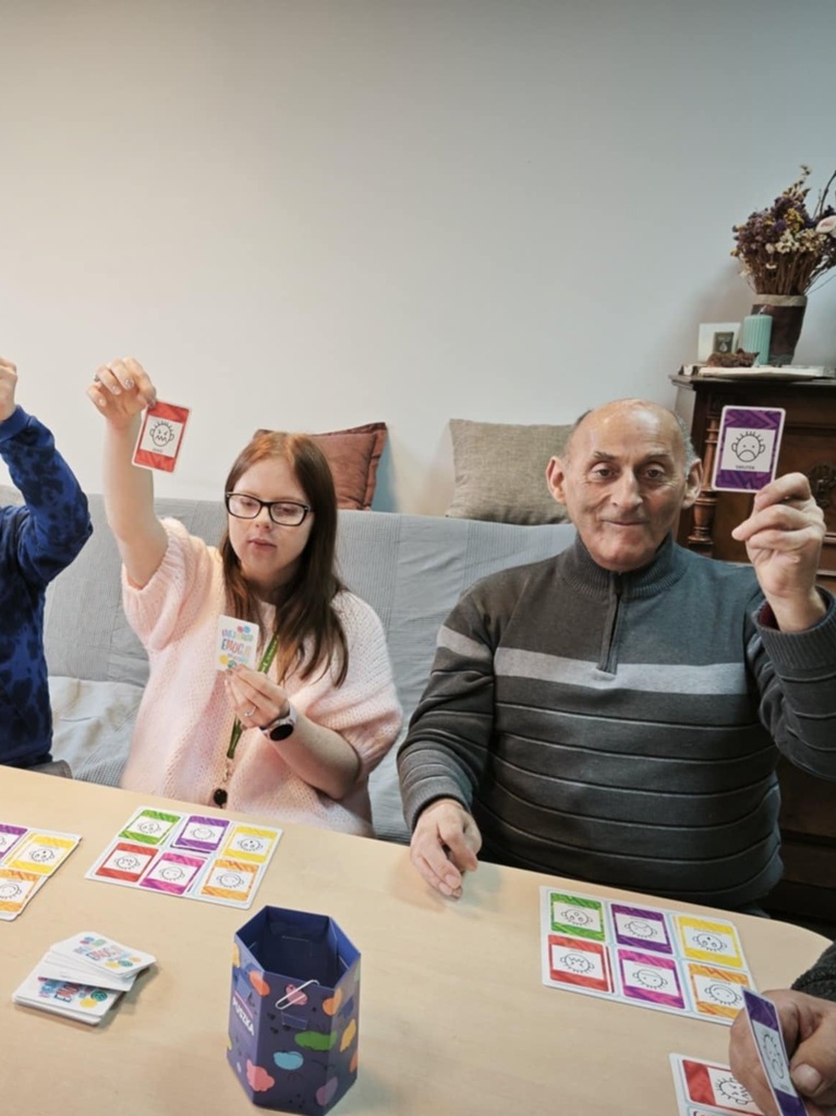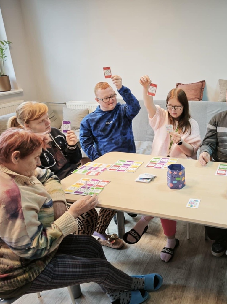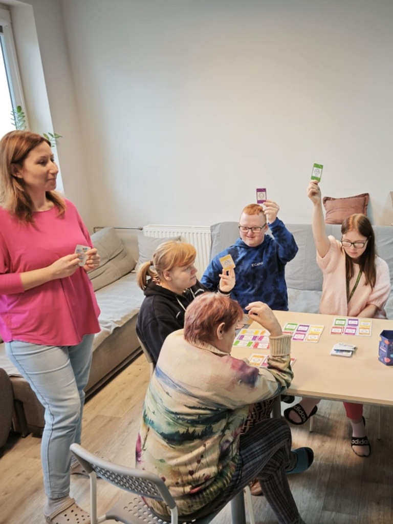 W naszym ośrodku część uczestników, w dwóch oddzielnych grupach, systematycznie bierze udział w Treningu Umiejętności Społecznych. Ostatnio na zajęciach z jednej z grup, uczestnicy trenowali rozpoznawanie, nazywanie i wyrażanie emocji podczas gry towarzyskiej „Kalejdoskop emocji”. Uczestnicy mieli za zadanie wskazać jakie emocje mogą towarzyszyć w konkretnych sytuacjach społecznych. Gra ta rozwija zdolność empatii, tolerancji, uwrażliwiania na drugiego człowieka i uczy właściwych relacji interpersonalnych. Dodatkowo proponowane zadania stymulują umiejętność myślenia przyczynowo – skutkowego. Ćwiczą również spostrzegawczość, koncentrację uwagi i pamięć oraz rozwijają umiejętności werbalne. Zajęcia były też okazją do wyzwolenia pozytywnych emocji.