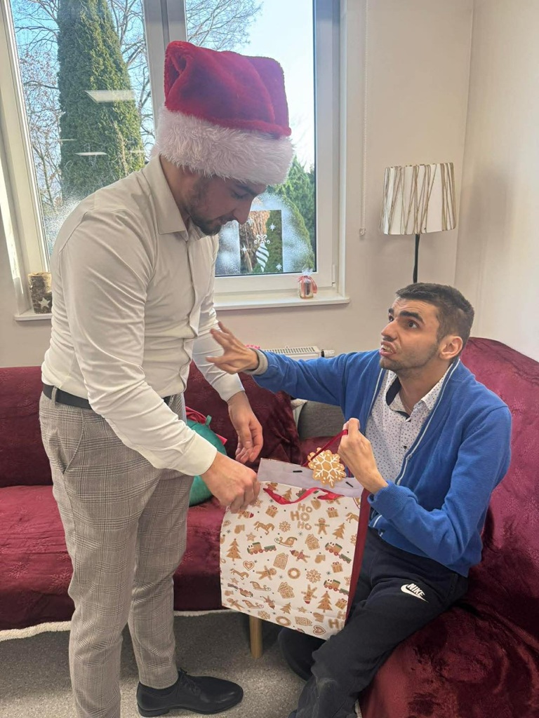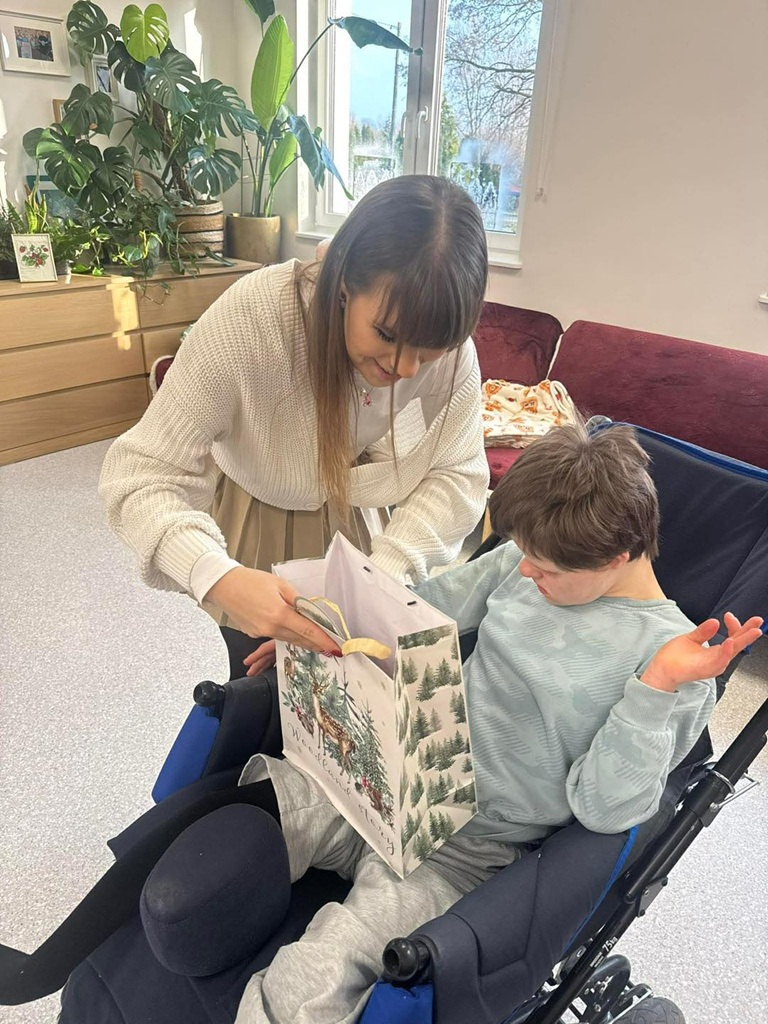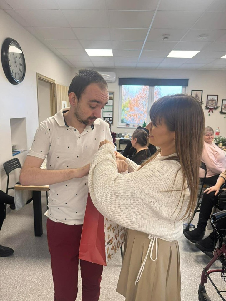 Nie zabrakło również pięknego momentu wręczania prezentów – każdy z nich był wyrazem pamięci, serdeczności i świątecznej życzliwości. Szczególne emocje towarzyszyły wręczeniu jednego wyjątkowego prezentu dla naszego uczestnika Irka, który był baaardzo grzeczny w tym roku prezent wywołał ogromny uśmiech i wzruszenie.