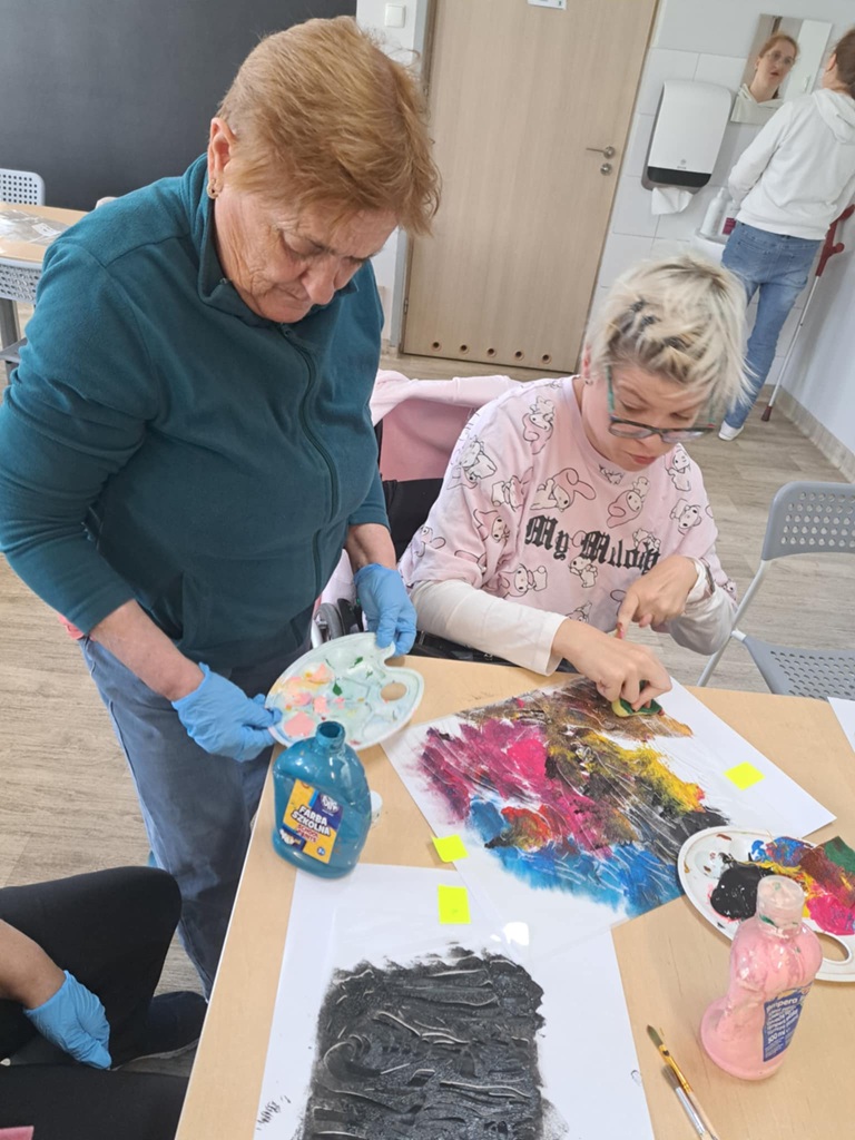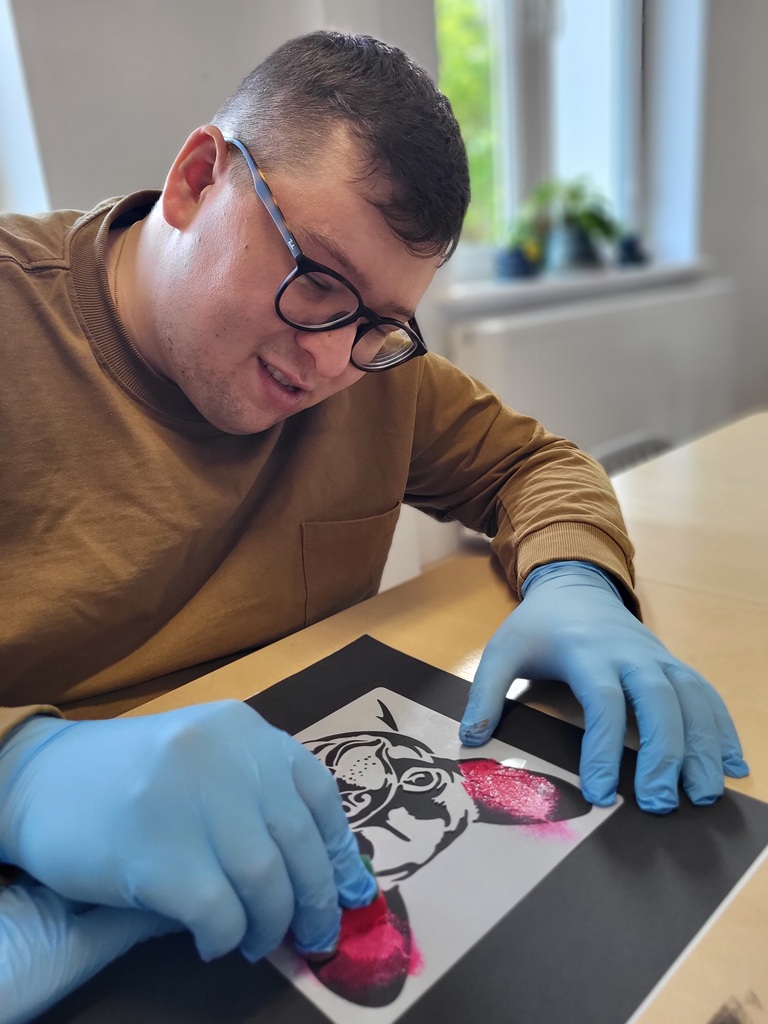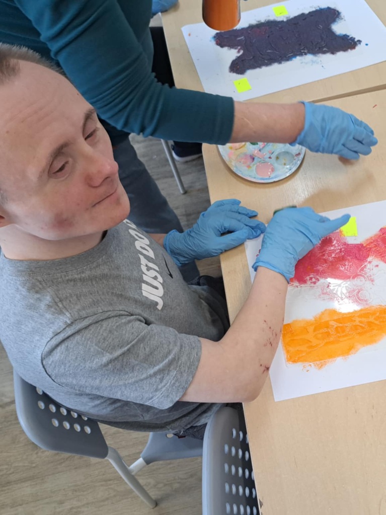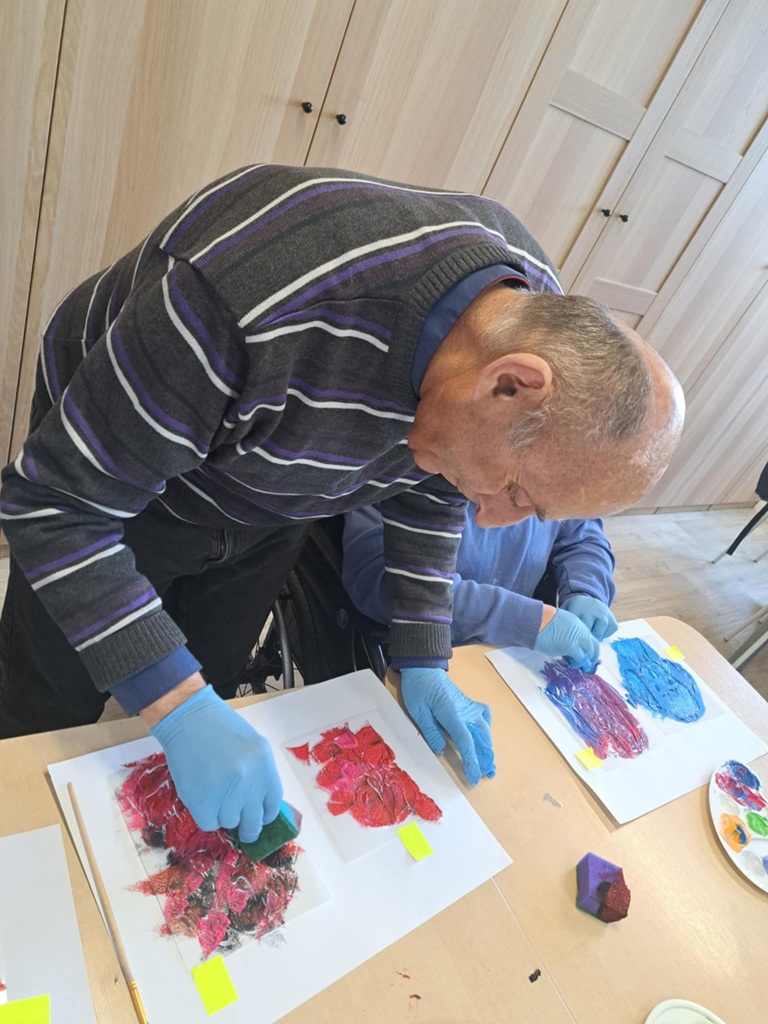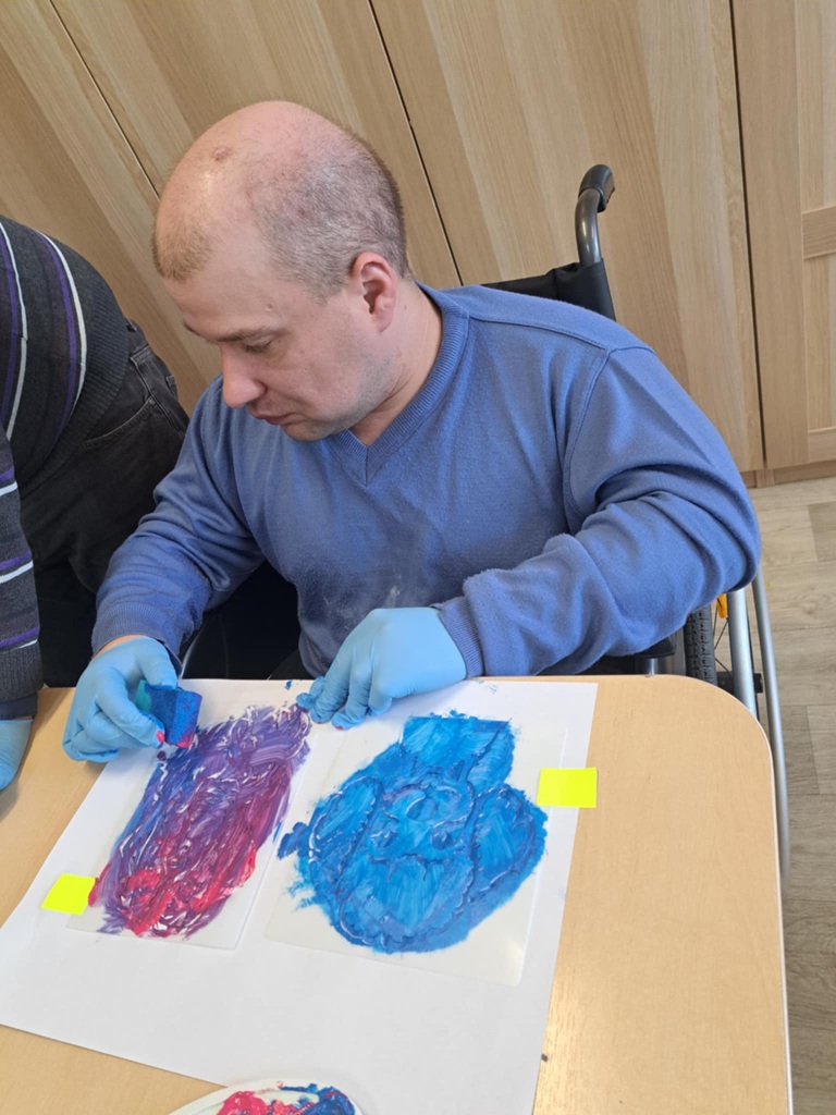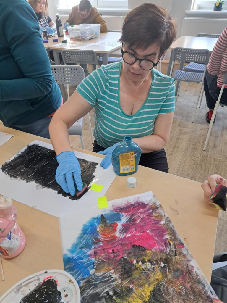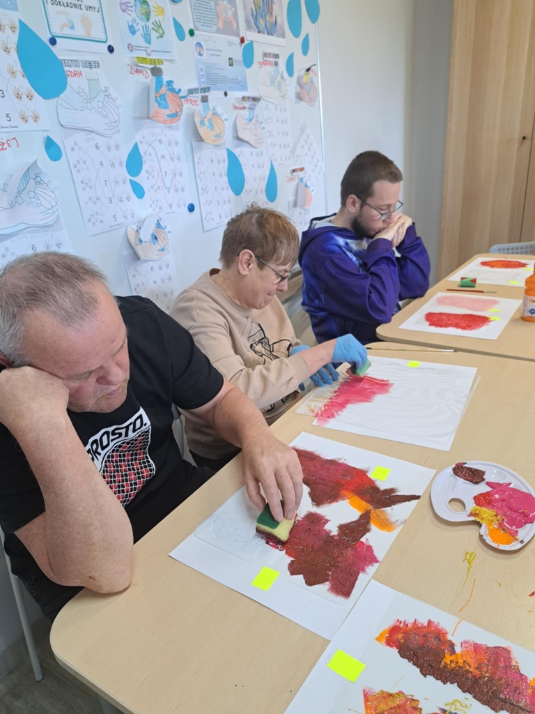 Na zajęciach manualnych, używając szablonów malarskich, tapowaliśmy farbę za pomocą gąbki. Stworzyliśmy bardzo efektowne prace!