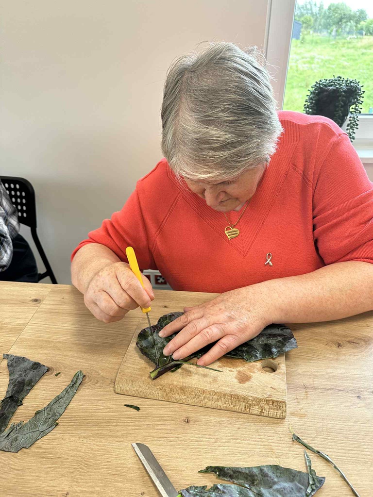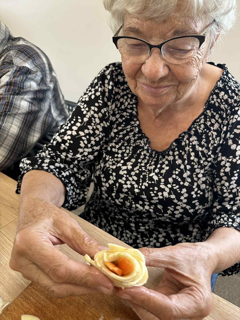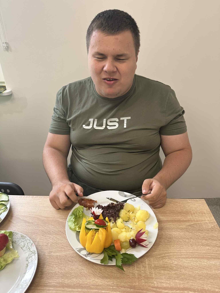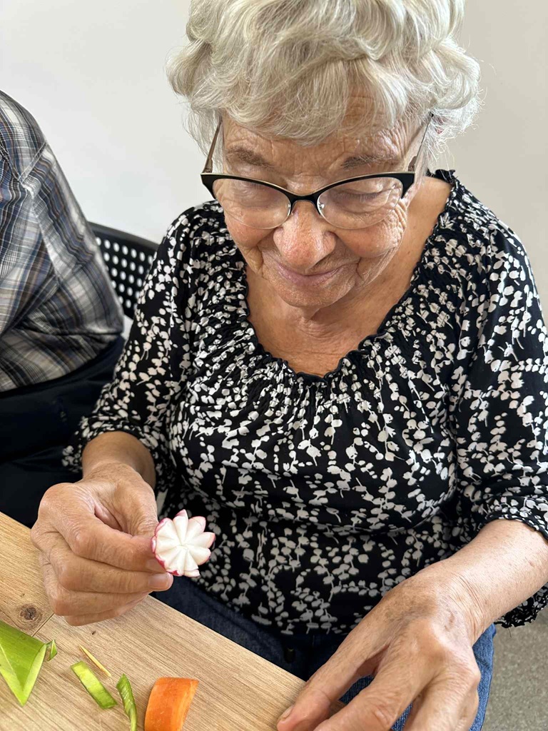Dziś w naszym Środowiskowym Domu Samopomocy odbyły się wyjątkowe zajęcia z carvingu, czyli sztuki rzeźbienia i ozdabiania potraw warzywami oraz owocami. Uczestnicy mieli okazję poznać różne techniki dekoracyjne i własnoręcznie przygotować piękne, kolorowe ozdoby, które zamieniły zwykłe talerze w prawdziwe małe dzieła sztuki. Największą przyjemnością było jednak to, że przygotowane dekoracje mogliśmy od razu wykorzystać – dzisiejszy obiad podany na tak pięknie ozdobionych talerzach smakował wszystkim jeszcze lepiej!