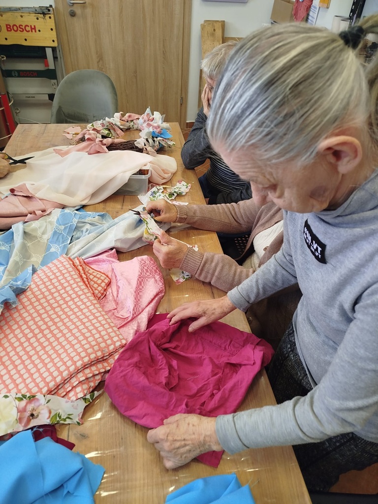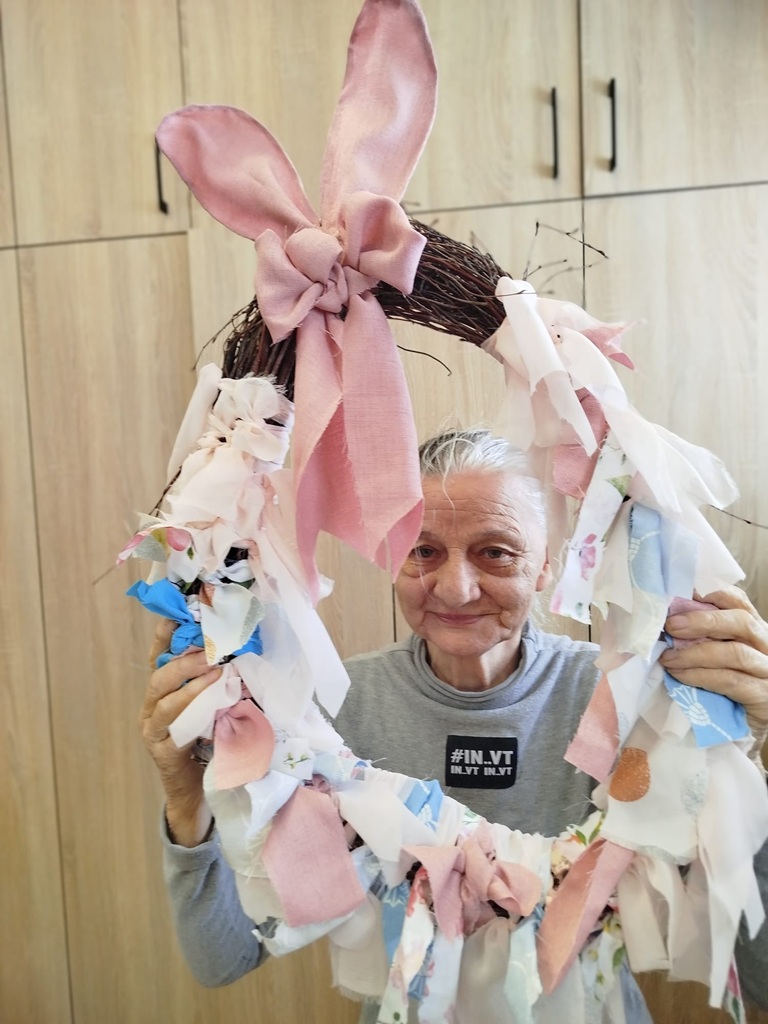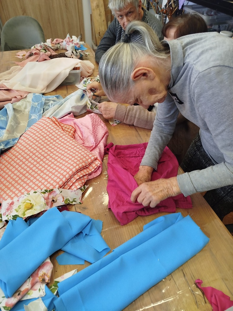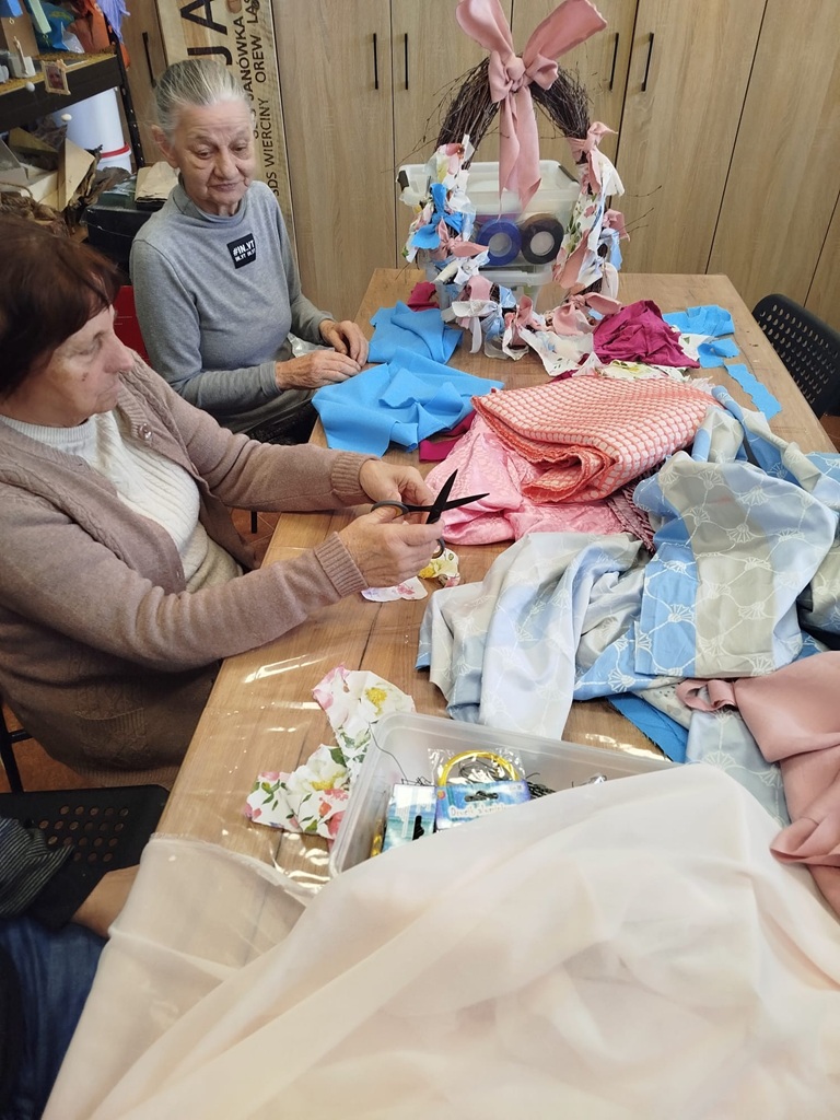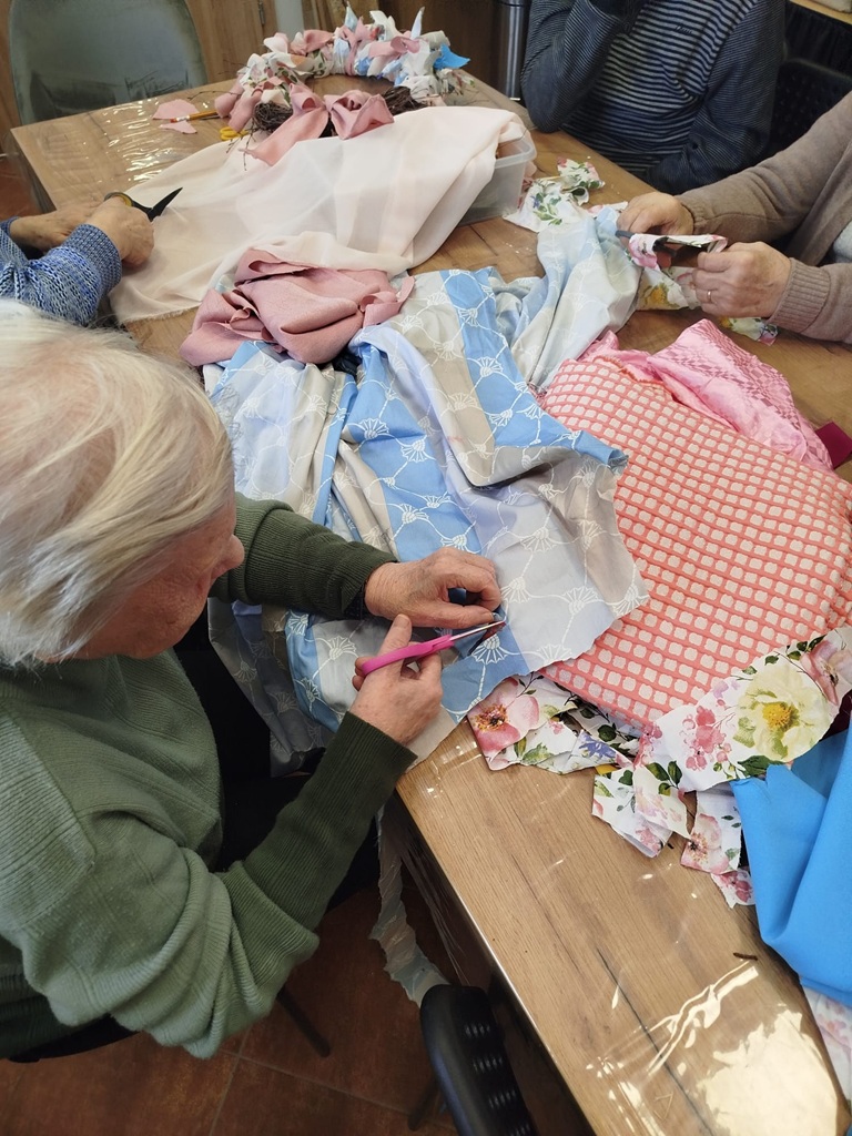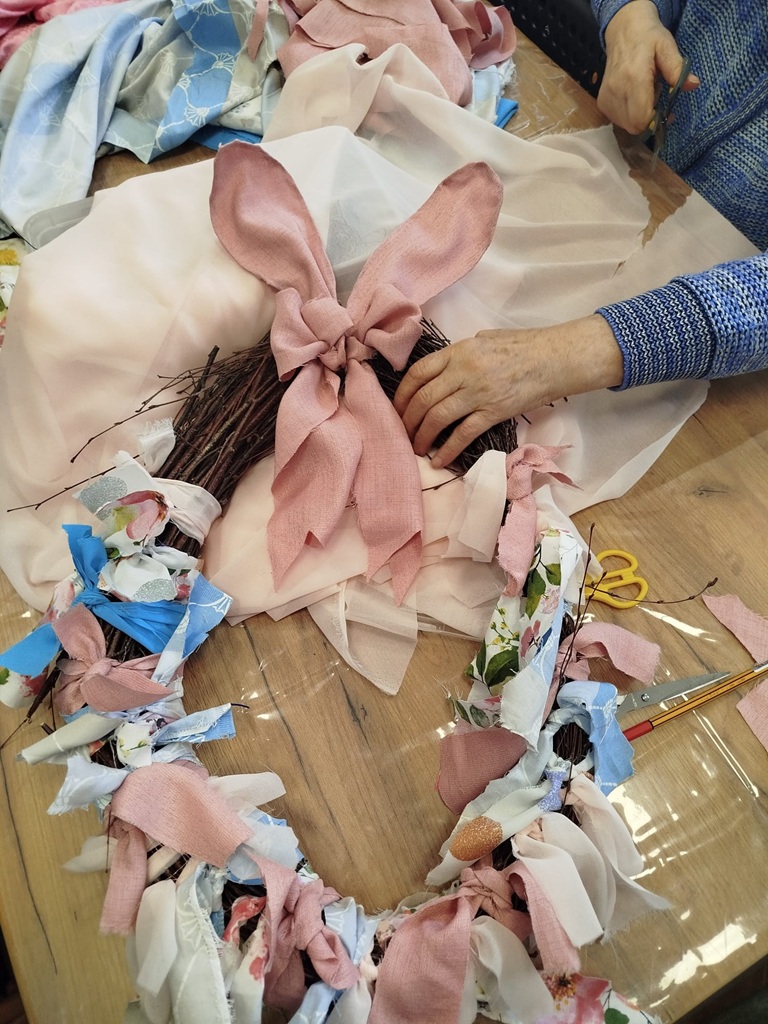 Twórczy czas z seniorami. Podczas ostatnich zajęć stworzyliśmy piękny, wiosenny wianek. Baza została przygotowana wcześniej, a nasi seniorzy z ogromnym zaangażowaniem wycinali tkaniny, dobierali kolory i wiązali je w całość. Efekt? Oceńcie sami!